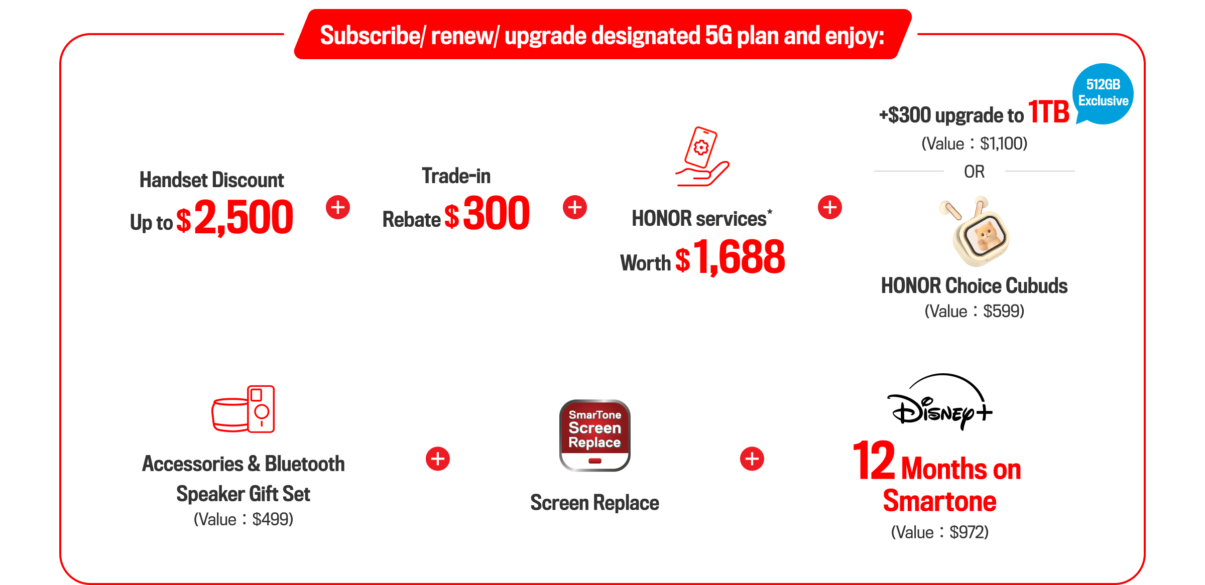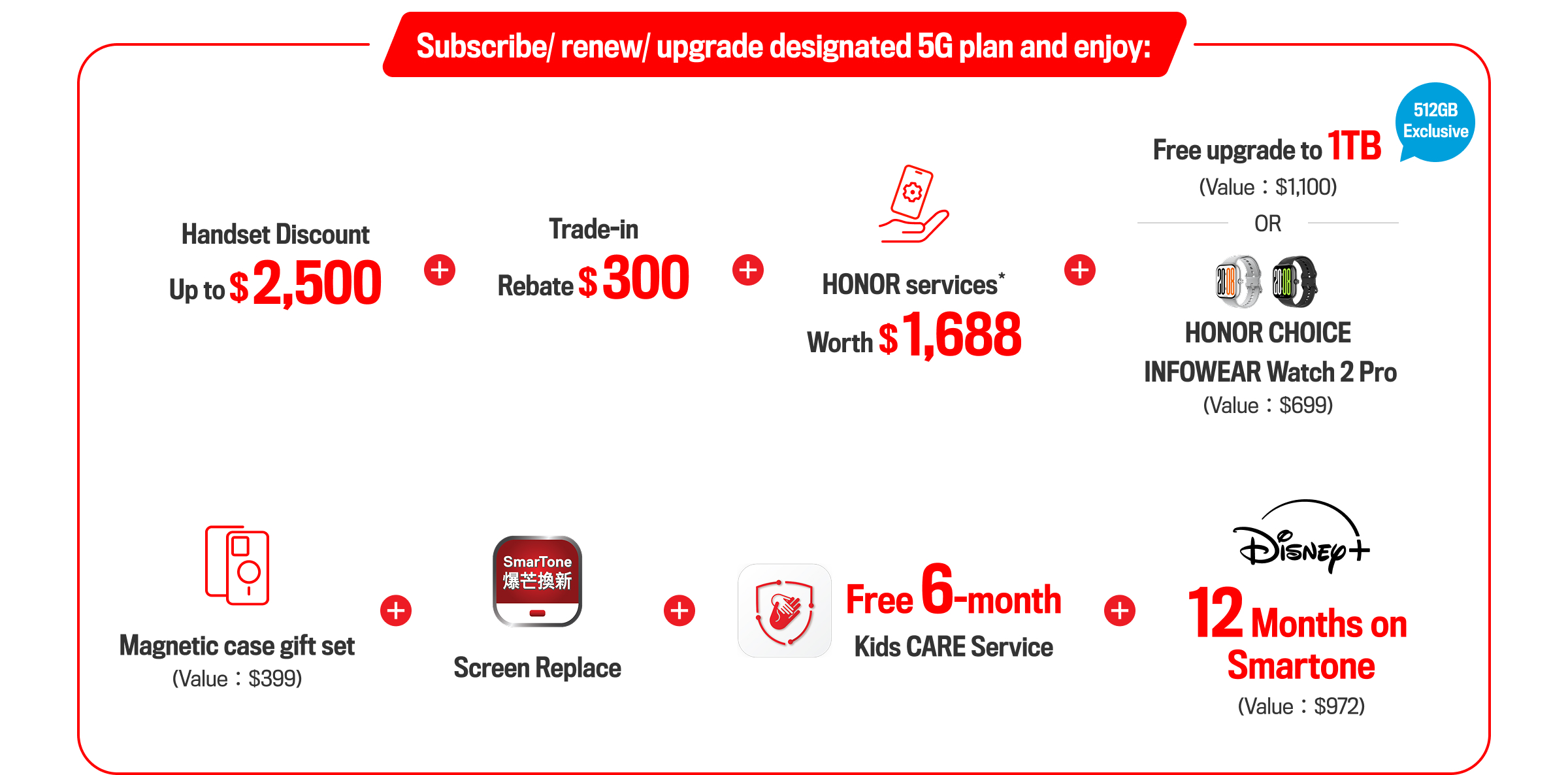 General Terms and Conditions:Limited quantity and while stocks last Each designated contract subscription is entitled to the above offer once only. The Company reserves the right to offer an alternative gift of equivalent or approximate value. This offer cannot be used in conjunction with other subscription / re-contract / upgrade / Add-on SIM card offers. The above offers will be forfeited if the customer changes to other service plans/ cannot activate the service in 180 days upon the contract subscription, and the Company has the right to charge the full amount of the gift without prior notice. This offer cannot be transferred to any third party and is neither refundable nor exchangeable for cash. The Company reserves the right of final decision relating to the promotions and any dispute thereof, and may change the terms and conditions without prior notice. Subject to relevant terms and conditions please ask our store assistants for details.