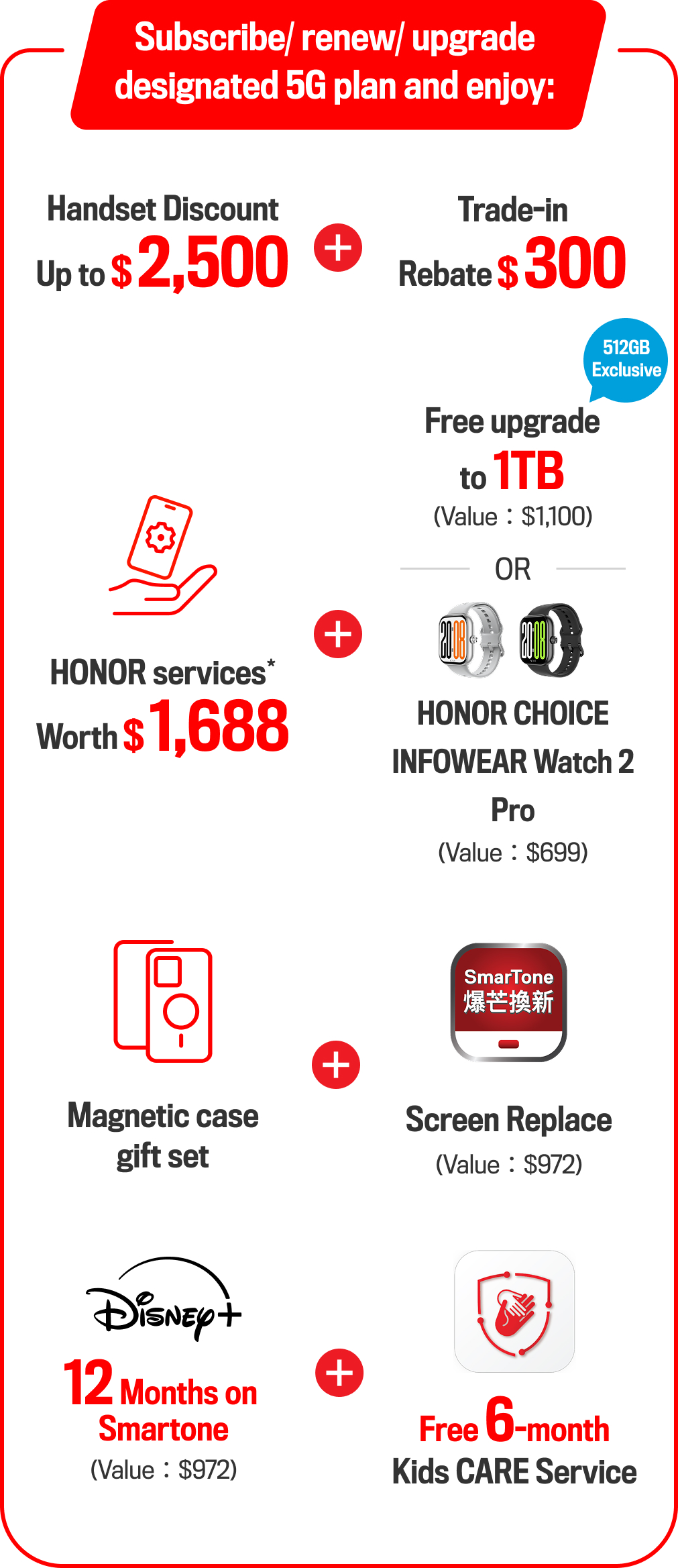 Up to $2,500handset discount is based on customers can purchase Honor Magic8 Pro 1TB at the Subscriber Special Price $6,799 (Recommend Retail Price: $9299) upon subscription of a designated service plan under fixed-term contract.