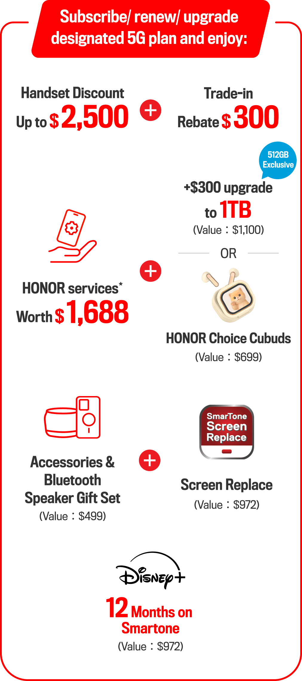 $400 Handset & Accessories Voucher Offer: Customers can enjoy Accessories Voucher Offer for designated handset and accessories purchase upon subscription of a designated service plan under fixed-term contract. A prepayment of designated amount of service fee is required (If applicable). Prepayment amount depends on the service plan selected. The prepayment amount will be credited to the customer according to the rebate arrangement specified in the Sales and Services Agreement (or Supplemental Agreement to the Sales and Services Agreement) upon the activation. The prepayment amount will be credited to customer’s bank account via Faster Payment System (FPS) or will be credited to customers' monthly bill and the mobile services plan must be still activated. Customers must ensure the accuracy and completeness of the FPS information provided (If applicable). The rebate method depends on customers' selection. Customer is required to purchase designated handset and accessories at the prevailing Recommended Retail Price / Subscriber Special Price/ designated special price at the Company's stores. The offer is valid for 180 days from the date of contract subscription or the date of contract renewal acceptance. Customer can use the discount offer for one transaction only within the validity period and enjoy 12 months' Upgraded Back-to-Front “SmarTone Screen Replace™” for free upon designated handset purchase.