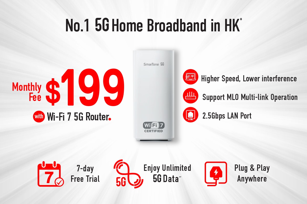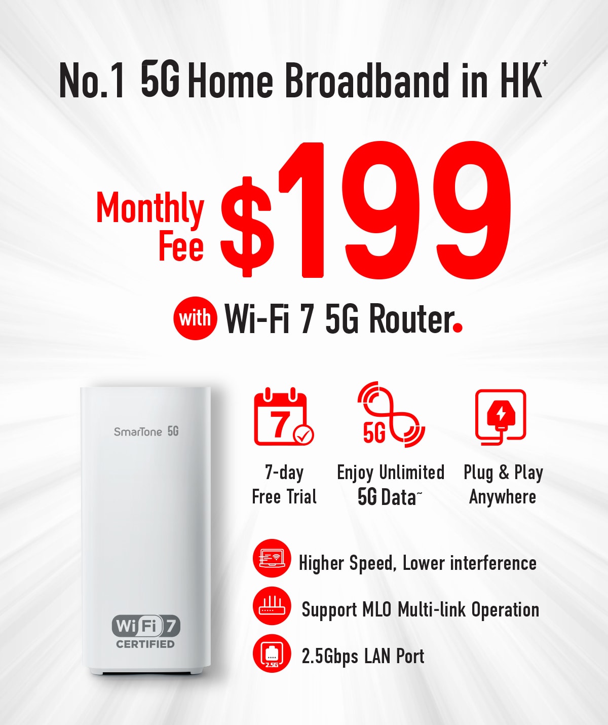 Offer valid for limited period only. Offer is appliable for customers who subscribe the designated SmarTone Home 5G Broadband service plan at a designated residential address for 36-month fixed term contract period. Average monthly fee HK$199 is calculated based on the original monthly fee HK$289 for Home 5G Broadband plan, after monthly rebate of HK90 within contract period have been given to the customer. Offers will be forfeited without any compensation if the Customer terminates the contract during the committed contract period. This service plan includes a HK$95 monthly rental fee for router rental service waived within the committed contract period. Customers are required to make a deposit of HK$1,500 for router rental service. Deposit of rental router will be fully refunded upon return of the router in good workable condition and can be waived if customers choose to settle the monthly fee with autopay. Upon the expiry of the committed contract period, the Customer will be charged at the prevailing plan price on monthly basis (inclusive of router rental fee(s) if any) if the customer continues to use the service. Customer who registers for the services for the first time is entitled to a 7-day Trial & Return Guarantee period commencing from the activation date of the designated service plan. If the Customer cancels the service plan within the 7-day Trial & Return Guarantee period, any other service plan(s) or value-added service(s) or related special offer subscribed together on the same application will also be cancelled and the Customer is not required to pay the monthly fee for the service and 5G Broadband service equipment rental and refund of fee paid by customer for purchasing 5G Broadband service equipment shall be arranged upon return of the 5G Broadband service equipment to the Company. The Company reserves the right of final decision relating to the promotion and any dispute thereof, and may change the Terms and Conditions without prior notice. For service plans and offers detail, please ask salespersons.