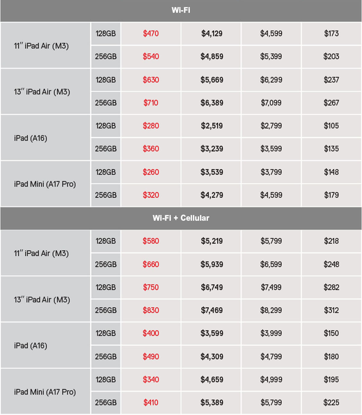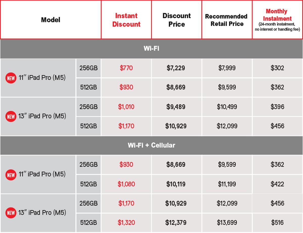 ^ "Up to $1,320 Discount" is calculated based on Customer purchases of 13-inch iPad Pro (M5) Wi-Fi + Cellular 512GB (Recommended Retail Price: $13,699) at Special Device Price $12,379 upon a contract subscription of a designated 5G service plan. *“Instalments As low as $302/month” is calculated based on customer purchases of 11-inch iPad Pro (M5) Wi-Fi 256GB (Recommended Retail Price: $7,999) at Special Device Price of $7,229 with the payment settlement by 24-month 0% interest rate instalment plan without handling charge by designated credit card issued by designated banks.