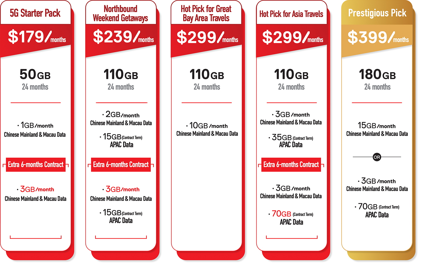Customers can enjoy Mainland & Macau Roaming Data Pack Offer and / or Asia Pacific RoamFlex Data Pass Offer for free during the contract period upon subscription of a designated service plan under fixed-term contract. The data usage of the Mainland & Macau Roaming Data Pack Offer and / or Asia Pacific RoamFlex Data Pass Offer to be given will depend on the contract subscription selected by the customer.