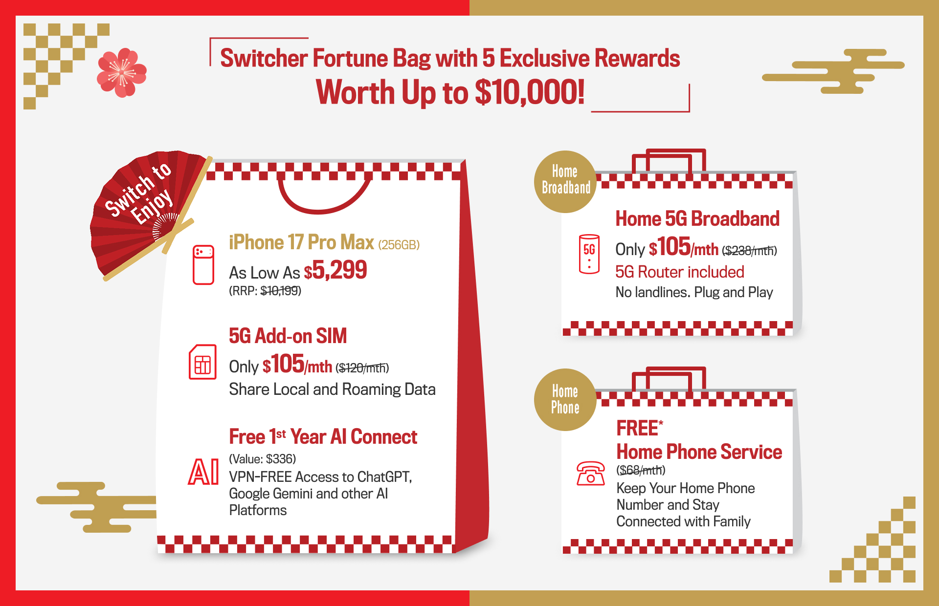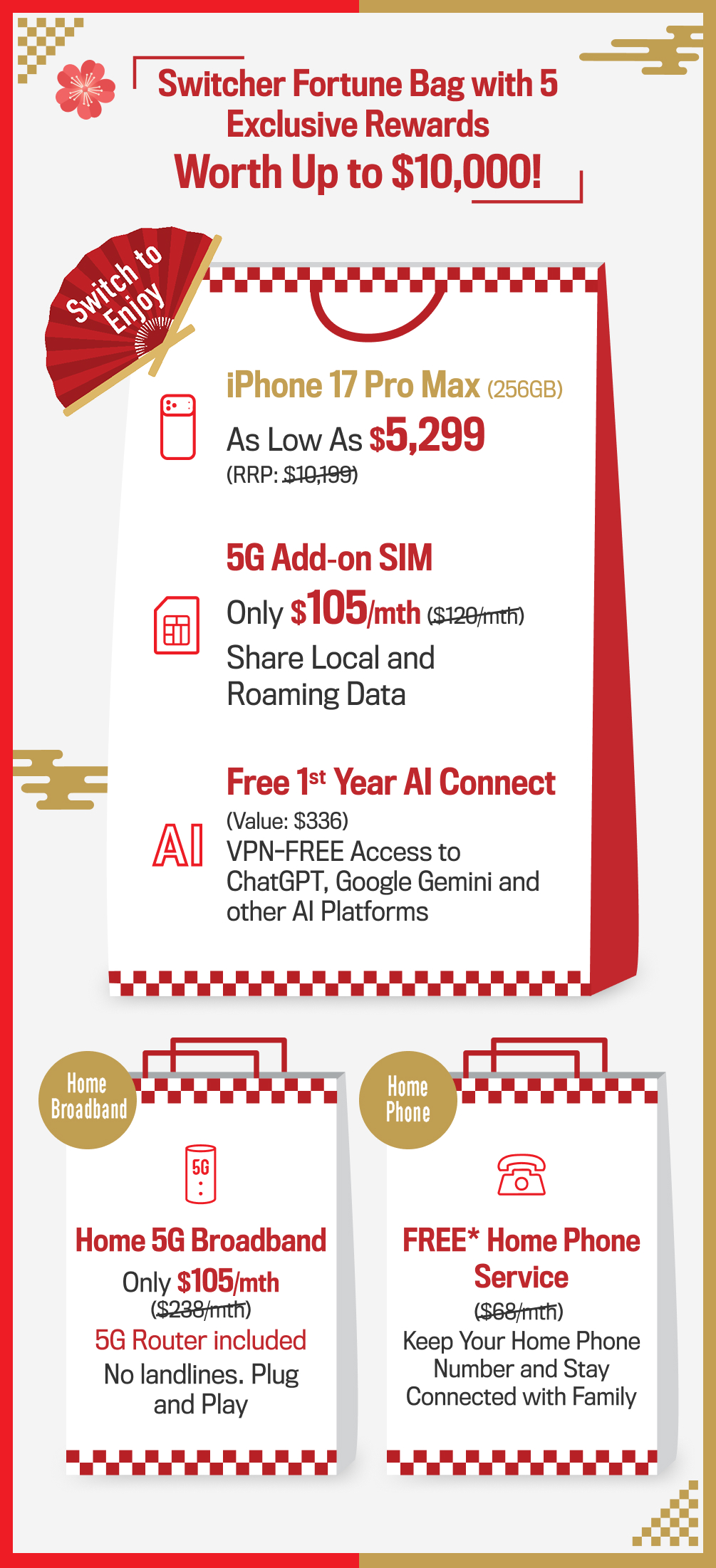 Handset price as low as $5,299 is based on customers can enjoy up to $2,500 Handset Voucher Offer upon 5G service plan under fixed-term contract, $500 Handset & Accessories Voucher Offer upon each 5G Add-On SIM card (up to $2,000) and $400 Handset & Accessories Voucher Offer on Welcome Reward for purchasing iPhone 17 Pro Max 256GB (Recommended Retail Price: $10,199) of a designated 5G service plan under fixed-term contract and 4 pcs 5G Add-On SIM cards at the same time. The value of the Handset Voucher Offer to be given will depend on the contract subscription selected by the customer.