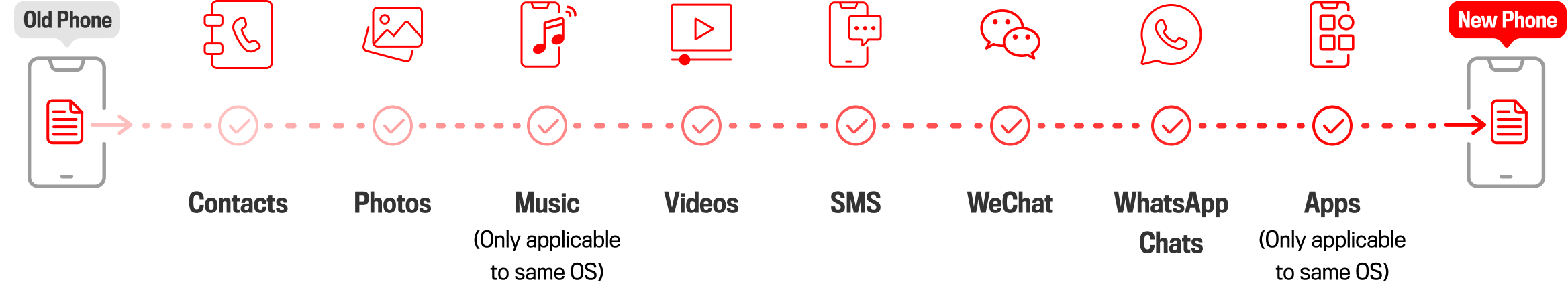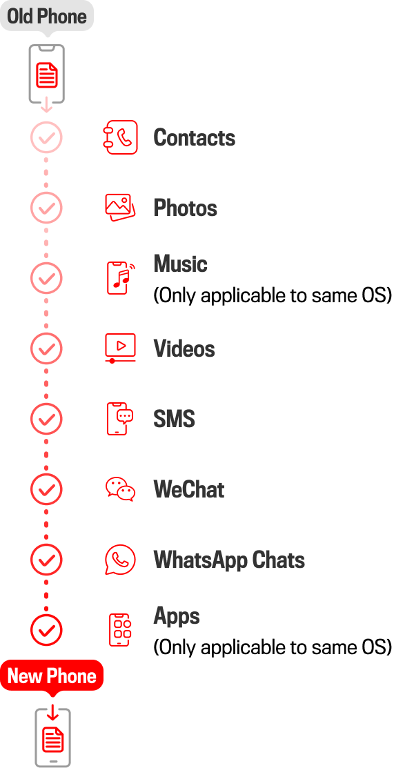 * For iOS devices, WhatsApp chat history will be transferred via iCloud. # If the brand of your newly purchased smartphone is Apple, Samsung or HUAWEI, please visit any SmarTone Store. For other smartphone brands, please visit the following stores: Causeway Bay Yee Wo Street, Kowloon Bay Telford Plaza 1, Tseung Kwan O PARK Central, Wan Chai Johnston Road or Yuen Long Kau Yuk Road.