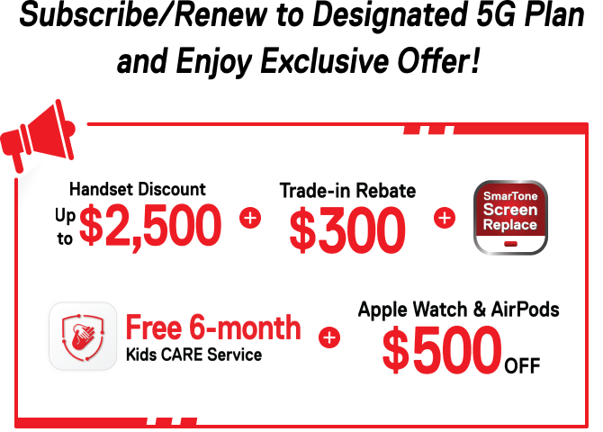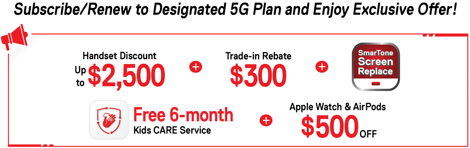 Handset Voucher $5,000 or above. A prepayment of designated amount of service fee is required (If applicable). Prepayment amount depends on the service plan selected. The prepayment amount will be credited to the customer according to the rebate arrangement specified in the Sales and Services Agreement (or Supplemental Agreement to the Sales and Services Agreement) upon the activation. The prepayment amount will be credited to customer’s bank account via Faster Payment System (FPS) and the mobile services plan must be still activated. Customers must ensure the accuracy and completeness of the information provided (If applicable). The offer is valid for 180 days from the date of contract subscription or the date of contract renewal acceptance. This offer cannot be used in conjunction with other Handset Voucher Offer. Customer can use the Handset Voucher Offer for one transaction only and can enjoy 12 months' Upgraded Back-to-Front “SmarTone Screen Replace™” for free upon designated handset purchase.