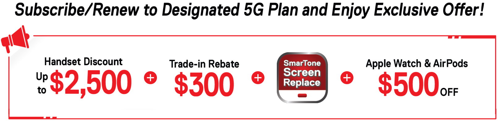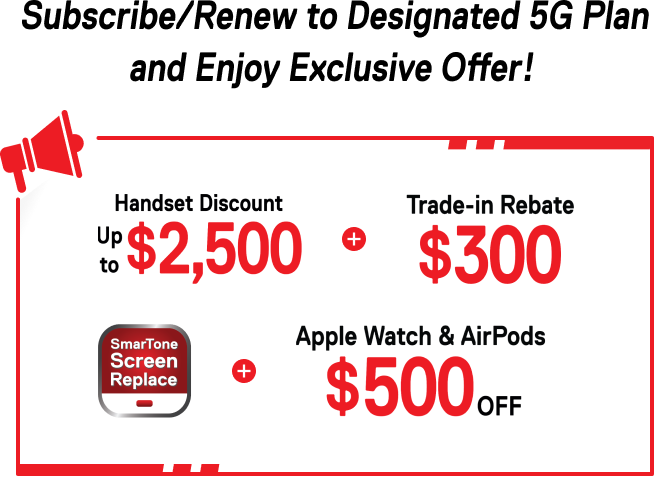 Up to $2,500 Instant Handset Discount is based on customers can enjoy up to $2,500 Handset Voucher Offer for designated handset purchase upon subscription of a designated 5G service plan under fixed-term contract. The value of the Handset Voucher Offer to be given will depend on the contract subscription selected by the customer.
