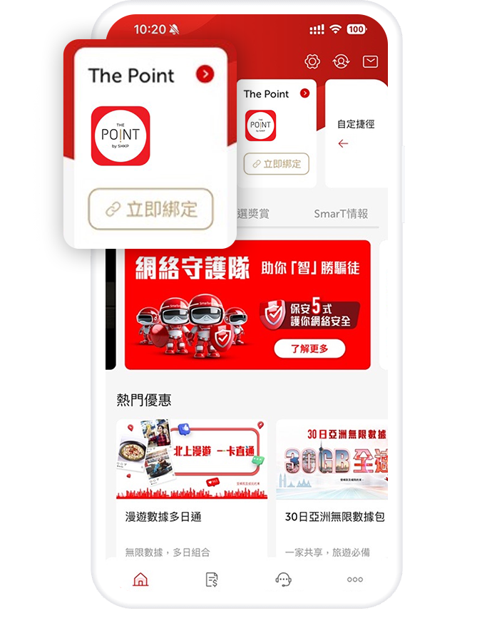 如你已綁定 The Point 賬戶,SmarTone CARE App內會顯示你的 The Point 總積分,以及你名下賬戶於 SmarTone 所賺的 The Point 積分紀錄。如想進一步了解從其他商戶賺的 The Point 積分,請到 The Point 手機應用程式查閱。