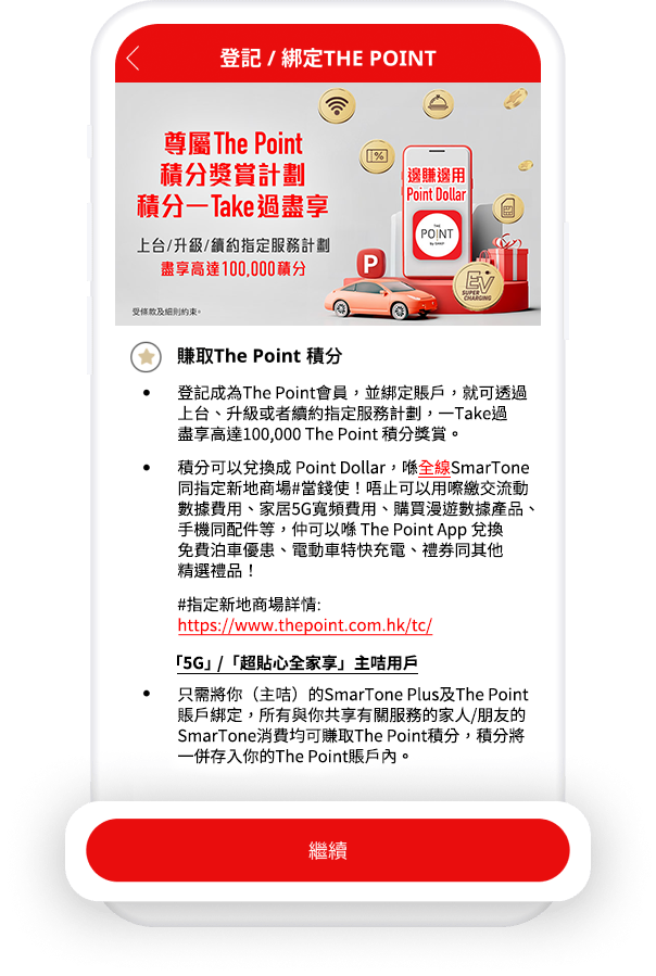 如你是「5G」/「超貼心全家享」副卡用戶,你所賺的 The Point 積分紀錄會顯示於主卡的 SmarTone CARE App內。