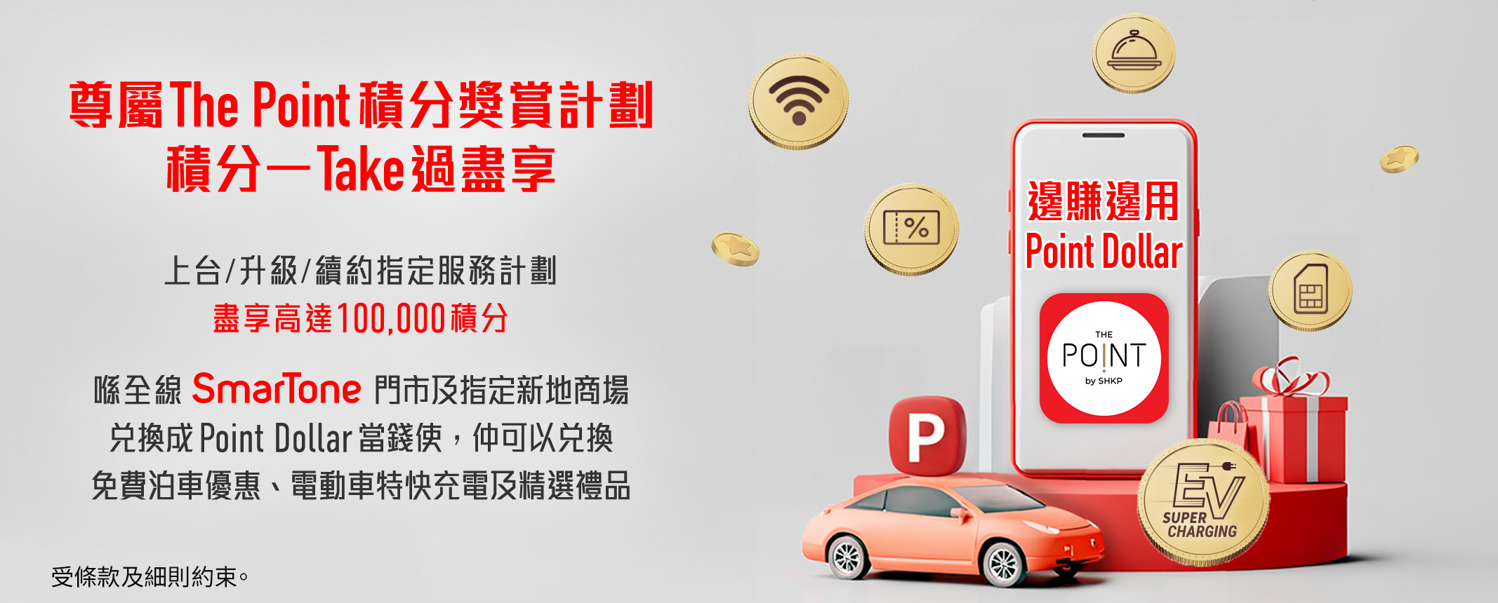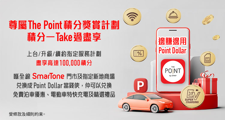 積分可透過 The Point 手機應用程式轉成 Point Dollar,於全線 SmarTone 門市當錢使,繳交流動數據或家居5G寬頻月費,購買漫遊數據產品、手機及配件等。亦可於全港指定新地商場當錢使,或到 The Point App 兌換免費泊車優惠、電動車特快充電、禮券及其他精選禮品等!