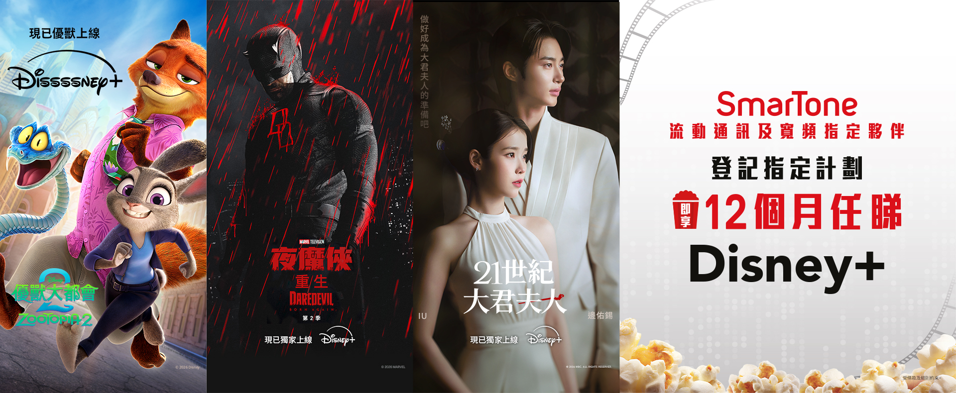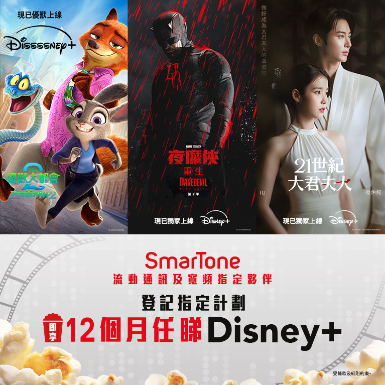 Disney+ 優惠:此服務只供 SmarTone 現有有效流動電話月費計劃、Home 5G寬頻服務計劃客戶使用。於合約期限屆滿後,本公司將按當時適用之零售價收費。如客戶於合約期限內取消此服務 / 轉用其他服務,將無權獲得回贈金額總值或任何餘額;在任何情況下客戶不得將該回贈轉換為現金。月費回贈優惠不可與其他優惠同時使用。