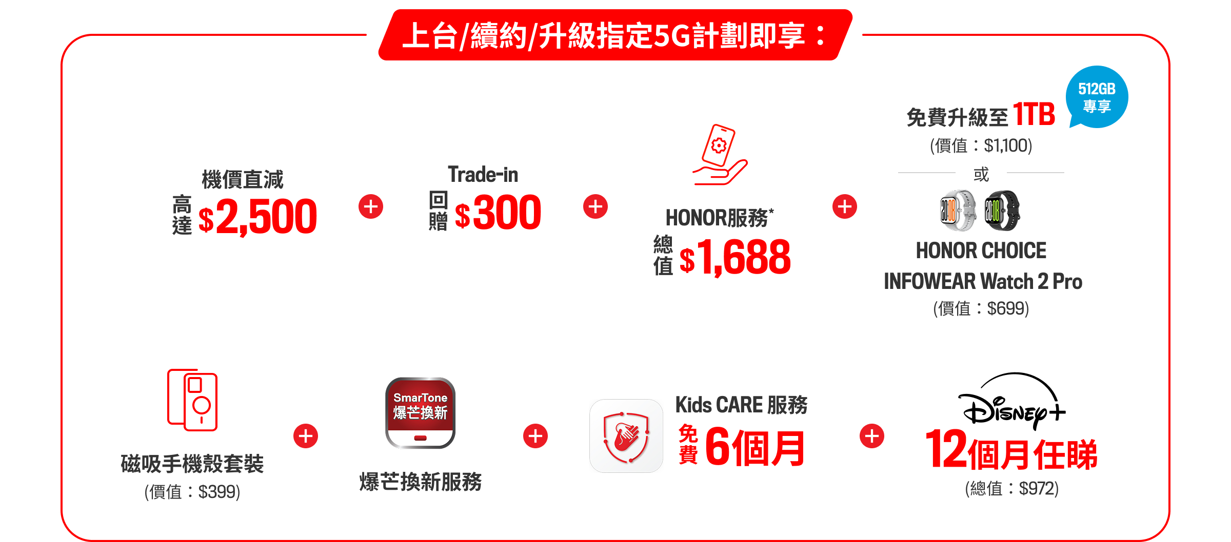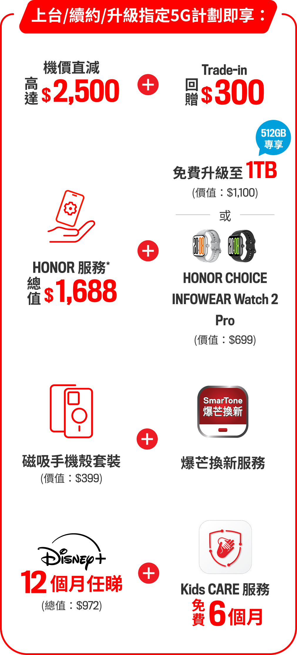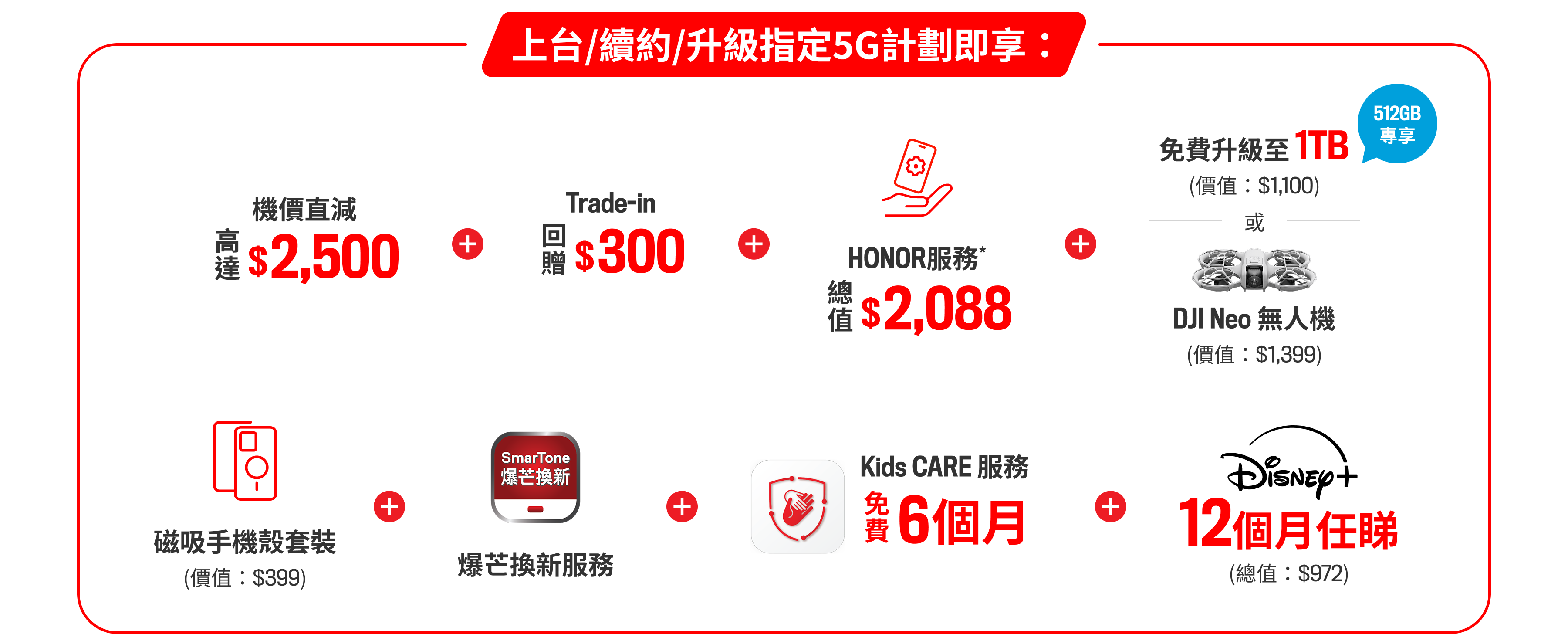 以上禮品(除「跟Plan 至抵價」免費升級至1TB外) ,均由榮耀香港提供並受條款與細則約束。如有任何查詢,請瀏覽榮耀香港Facebook專頁: fb.com/honorhongkong。
