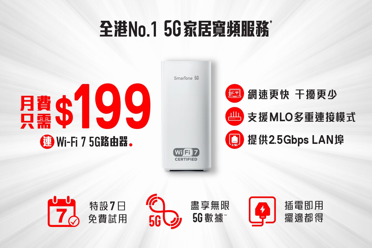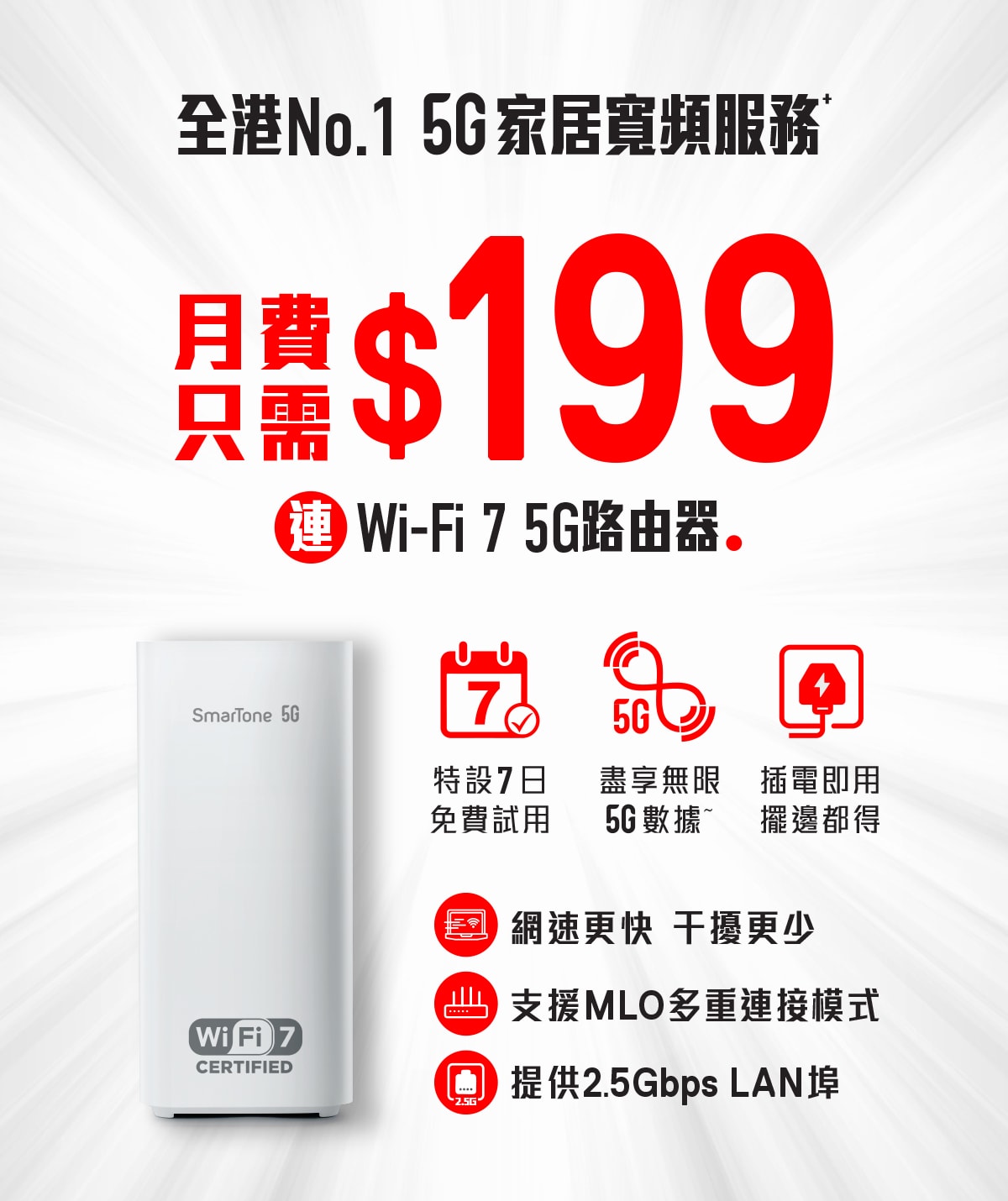 優惠期有限。優惠只適用於指定住宅地址申請指定SmarTone Home 5G寬頻服務計劃之客戶,並須簽 36 個月固定期限合約。優惠平均月費HK$199根據原價月費HK$289 Home 5G 寬頻月費計劃 ,於合約期內扣除每月HK$90回贈計算得出。客戶於承諾之合約期內終止合約,適用之優惠亦會同時於沒有任何補償的情況下終止。此服務計劃包括租用路由器服務並於合約期內豁免每月HK$95租機費。客戶須繳交HK$1,500借用路由器服務按金。路由器租用按金可於歸還狀態良好的路由器後全數退回,如客戶選擇自動轉賬繳交月費,可豁免路由器租用按金。於合約期限終止後,如客戶繼續使用此服務,本公司將按照當時同等服務計劃之月費收費 (包括路由器租用費(如有))。新申請本服務的客戶可於服務生效日期起可享有7天的試用保證。如客戶於7天試用保證期內終止服務計劃,同一申請內之其他服務/增值服務/相關優惠將同時取消,客戶將不須支付任何已使用設備租借/服務/服務計劃之費用,已支付賬單內的服務月費及作購買5G寬頻裝置之費用,可於退還5G寬頻裝置給本公司時安排退款。本公司保留對優惠及任何爭議之最終決定權,並可更改優惠之條款及細則而不作另行通知。有關服務及優惠詳情,請向銷售員查詢。