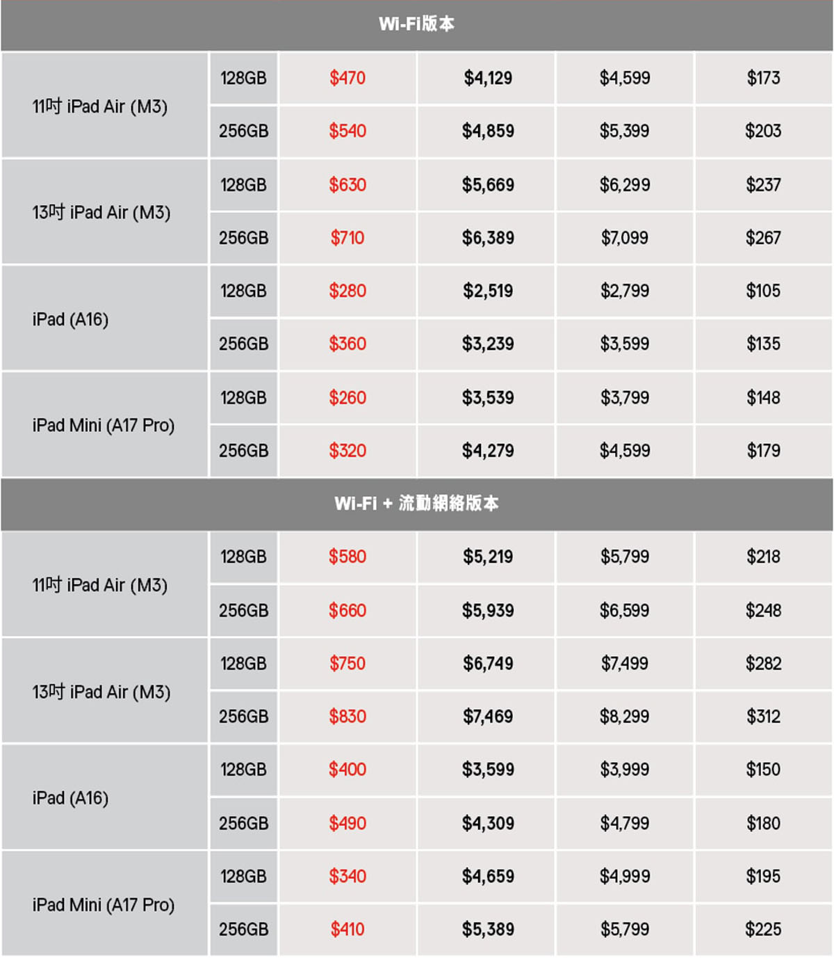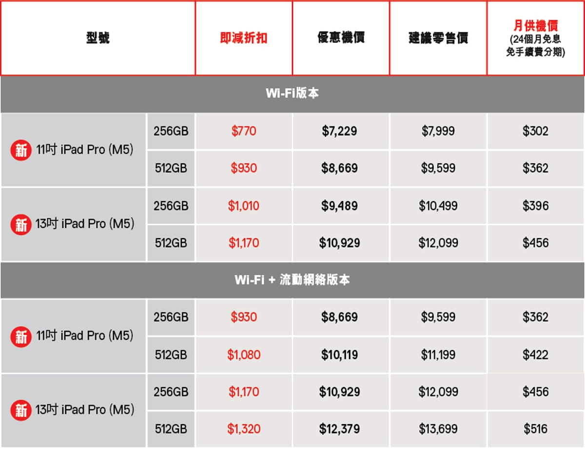 ^「機價即減高達 $1,320」指客戶選用指定5G合約期限服務計劃,可享優惠機價$12,379購買13吋 iPad Pro (M5) Wi-Fi + 流動網絡 512GB (建議零售價: $13,699)。*「分期低至$302/月」是基於客戶以指定銀行發行之指定信用卡以24個月免息分期及免手續費形式簽賬以優惠機價$7,229購買11吋iPad Pro (M5) Wi-Fi 256GB (建議零售價: $7,999) 平均計算得出。