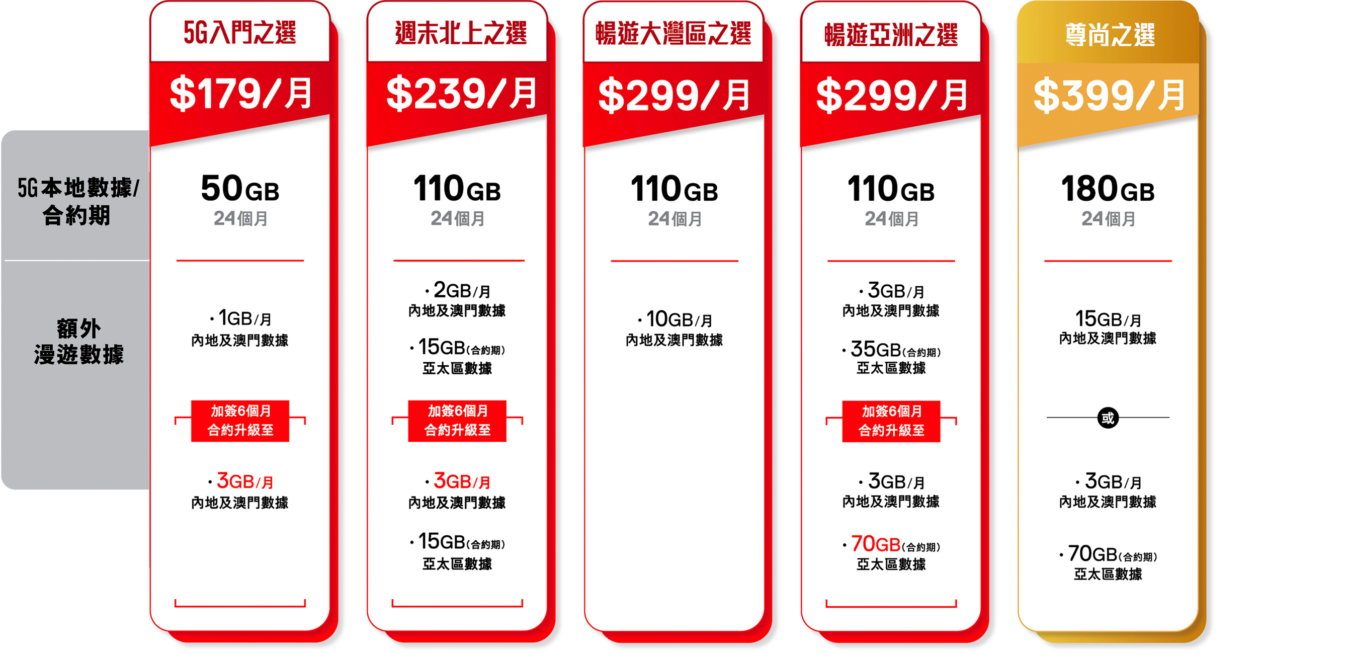 $179/ $239/ $299/ $399月費計劃:月費$179/ $239/ $299/ $399是基於5G SIM Only服務計劃原價月費$238/ $398/ $398/ $498,於合約期限內每月扣除$59/ $159/ $99/ $99合約回贈。於合約期限終止後,如客戶繼續使用此服務,本公司將按照當時同等服務計劃之月費收費。