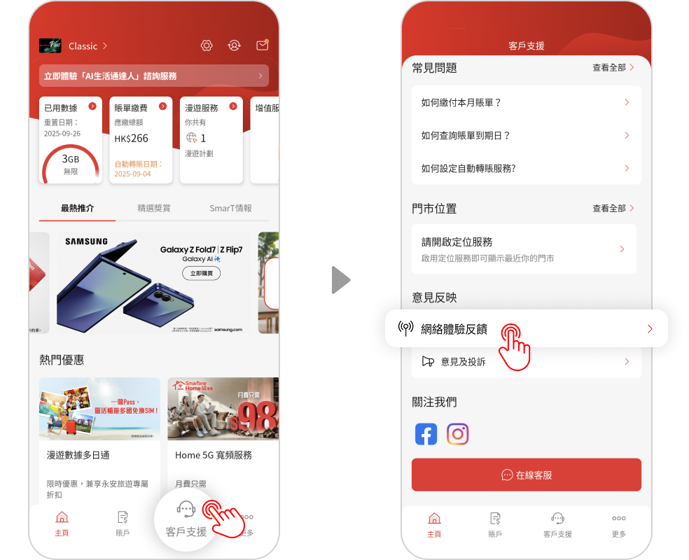 網絡體驗對你非常重要,所以對我哋亦非常重要。如你遇到任何網絡問題,我哋希望第一時間知道,以作出跟進及適當改善。如遇到任何數據/話音問題,可簡便地透過SmarTone CARE 應用程式 > 「客戶支援」> 「網絡體驗反饋」告知我們。我哋會積極跟進及作出適當改善,如你希望知道有關跟進情況及結果,我哋亦會與你聯絡