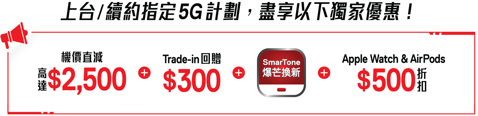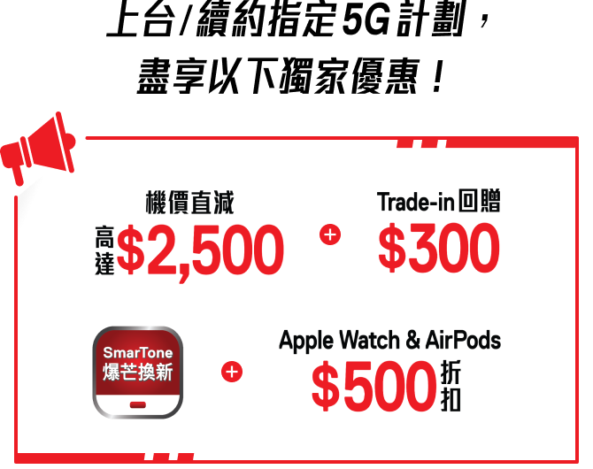 數碼通後付流動服務客戶或Home 5G寬頻服務計劃客戶 (「現有客戶」) 購買指定品牌及型號之手機或平板電腦,每部可享 $300「Trade-in回贈」。