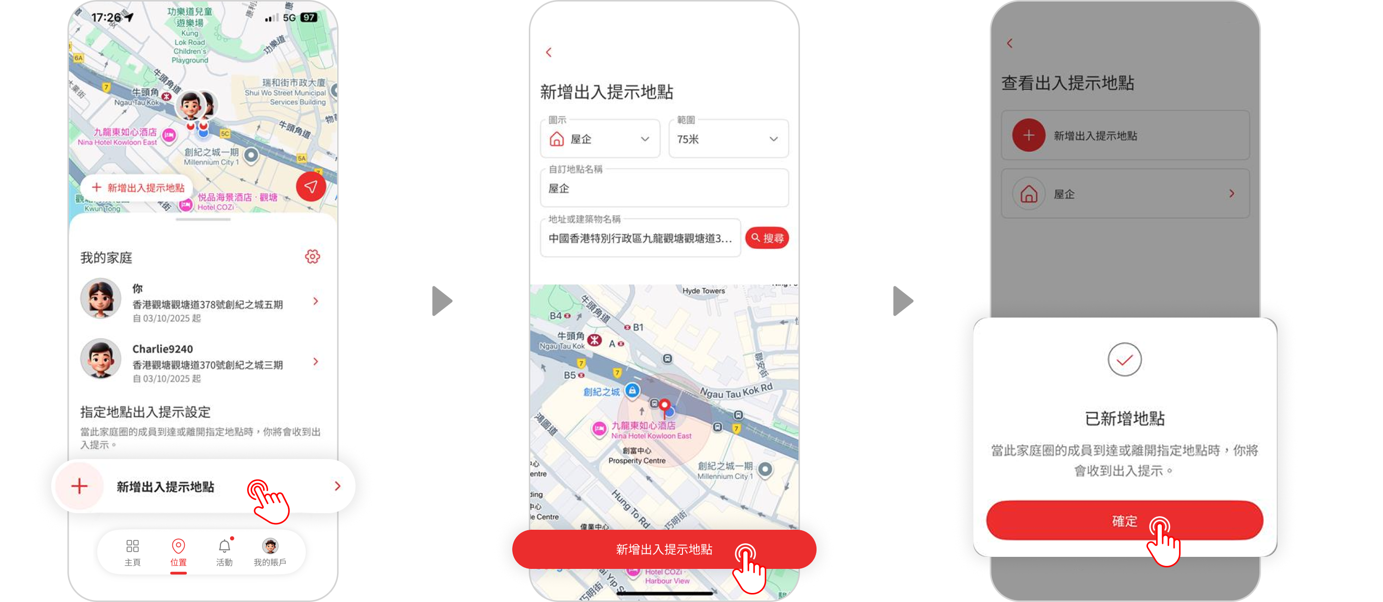 你可到相關「家庭圈」主頁,點按「位置」並向下滑到「指定地點出入提示設定」選項,然後選擇「新增出入提示地點」以設定出入提示。