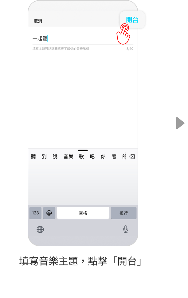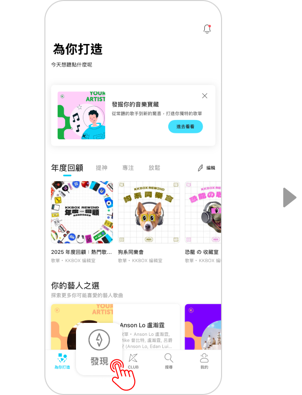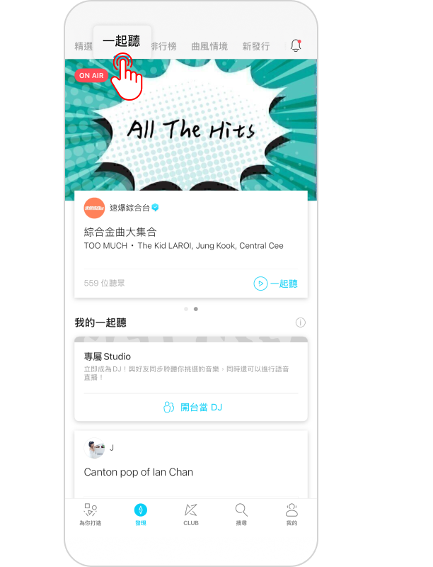 請於應用程式點選「發現」,然後點選「一起聽」, 你將會睇到在線名人嘅資訊。