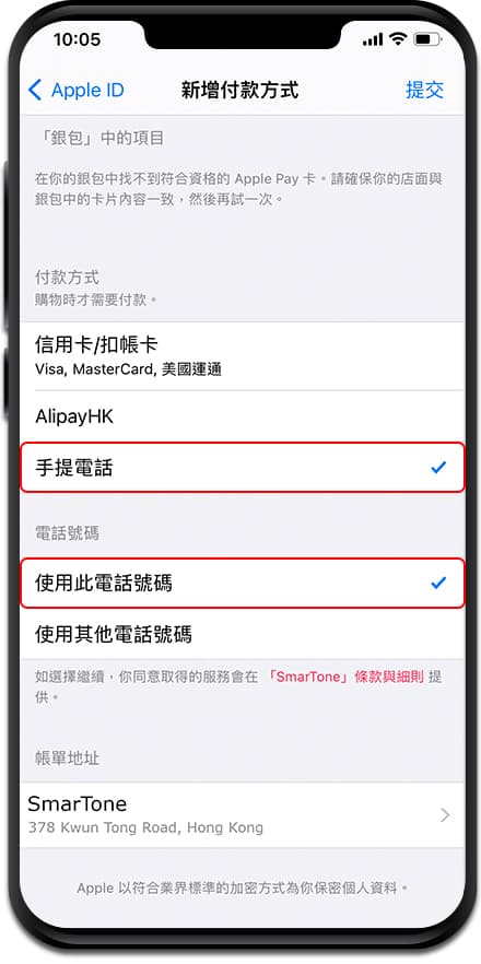 - 剔 選 「 手 提 電 話 」 及 「 使 用 此 電 話 號 碼 」